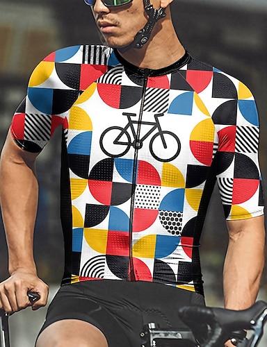 男性用 サイクリングジャージー 幾何学模様 おかしい 半袖 バイク ジャージー トップス 3つのリアポケット付き マウンテンサイクリング ロードバイク 速乾性 反射性ストリップ 後ポケット 吸汗性 スポーツ ブラック イエロー レッド 衣類