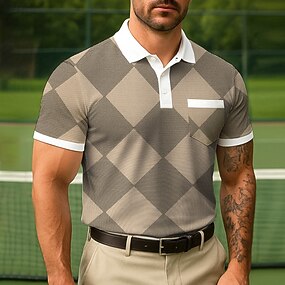 男性用 幾何学的な ライン ポロ 半袖 ポロシャツ 襟付きシャツ ビジネスカジュアル アウトドア アスレイジャー デイリーウェア ポケット 3Dプリント ボタン 夏 ブラック ブルー パープル