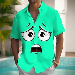 男性用 カートゥン おかしい 人間の顔 シャツ サマーシャツ ボタンアップシャツ 半袖 ファッションカジュアル バケーション パーティー 祝日 夏 春 折襟 3Dプリント 襟付きシャツ フロントポケット1つ グリーン
