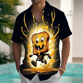 男性用 カートゥン トースト&バター シャツ サマーシャツ ボタンアップシャツ 半袖 おかしい アウトドア バケーション 日常着 夏 春 折襟 3Dプリント 襟付きシャツ フロントポケット1つ ブラック