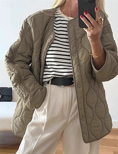 女性用 パフジャケット キルティングジャケット カジュアルジャケット 快適 高通気性 ジッパー ポケット カジュアル 平織り バケーション ストリート カジュアル デイリーウェア ジッパ- ショート ロング 折襟 レギュラー 長袖 アウターウェア ブラック カーキ色 アーミーグリーン 春 秋