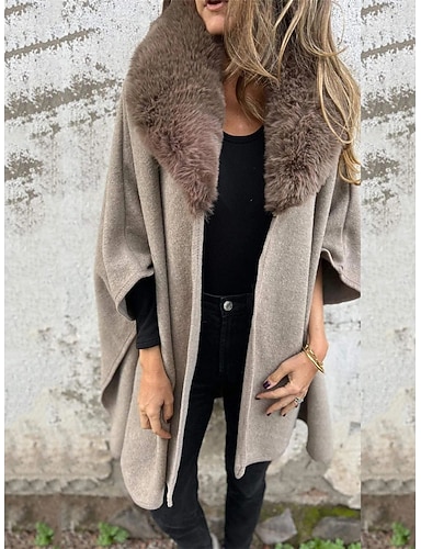 女性用 クローク / 岬 アウトドア ストリート デイリーウェア 秋 冬 レギュラー コート レギュラー 保温 高通気性 スタイリッシュ カジュアル ジャケット 長袖 縞 フェイクファートリム カーキ色 アプリコット グレー