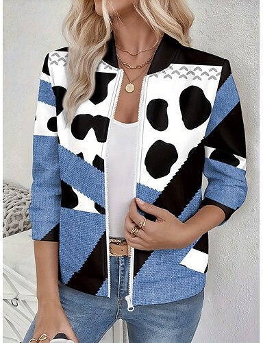 女性用 カジュアルジャケット 快適 高通気性 ジッパー プリント カジュアル ストリートスタイル 幾何学模様 バケーション ストリート カジュアル デイリーウェア ジッパ- ショート スタンド ルーズフィット 長袖 アウターウェア ブラック ホワイト フクシャ 春 秋