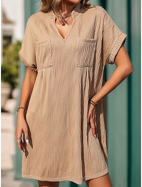 女性用 カジュアルドレス ミニドレス ポケット カジュアル Vネック 半袖 カーキ色 カラー