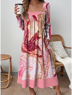 女性用 ミディドレス シフトドレス カジュアル 日常 ルーズフィット グラフィック 幾何学模様 抽象的 長袖 スクエアネック ピンク ブルー パープル グリーン 春 秋 冬