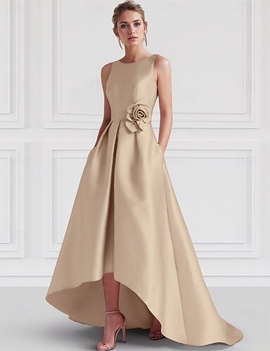 ビーチウェディング Aライン カクテルドレス エレガント ドレス フォーマル ウェディング ゲスト フロア丈 ノースリーブ ボートネックドレス ポケット付き サテン ドレス