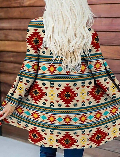 女性用 冬物コート トレンチコート ライトウェイト 快適 プリント オープンフロント ヴィンテージ ファッション カジュアル ボヘミアンヴィンテージ 幾何学模様 バケーション カジュアル ロング ノーカラー レギュラー 長袖 アウターウェア ルビーレッド ブルー パープル 春 秋