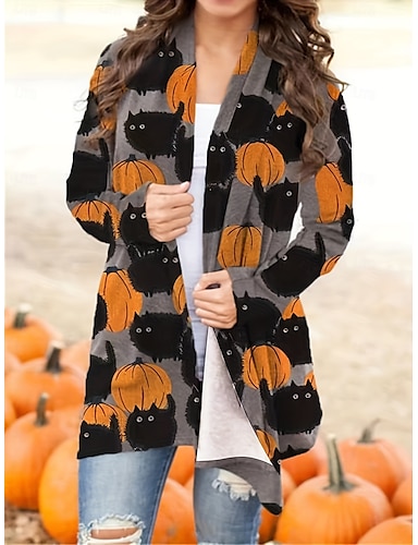 ハロウィン レディース コート 軽量 快適 パンプキン プリント オープンフロント ヴィンテージ アート カジュアル スカル カジュアル レギュラー カラーなし レギュラーフィット 長袖 アウター ブラック ブルー オレンジ 春 秋