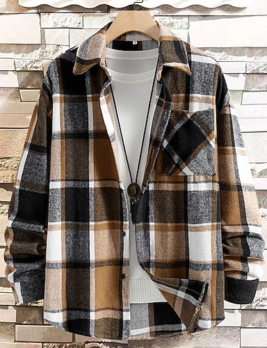 男性用 シャケット シャツジャケット 冬物ジャケット チェック バケーション デイリーウェア コーヒー 長袖 ラペル 秋 冬 衣類 ポケット