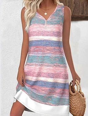 女性用 ミディドレス カジュアルドレス サマードレス ファッション 近代の 日常 ビーチ 週末 レギュラー ストライプ ノースリーブ Vネック ピンク 春 秋