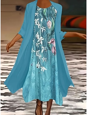 女性用 ドレスセット サマードレス カジュアル フォーマル フラワー グラフィック 多層式 プリント ミディドレス 七分袖 クルーネック 日常 祝日 ブルー パープル オレンジ 夏 春 レギュラー