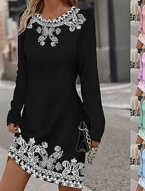 女性用 ひざ丈ドレス ニットワンピース カジュアルドレス T シャツドレス サンドレス カジュアル レギュラー グラフィック ペーズリー 長袖 クルーネック ピンク ブルー パープル ブラウン 春 秋 冬