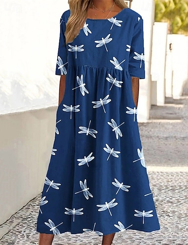 女性用 ミディドレス カジュアルドレス サマードレス ファッション 近代の 日常 ビーチ 週末 レギュラー 動物 フラワー ハーフスリーブ クルーネック ライトパープル ダークブルー 春 秋