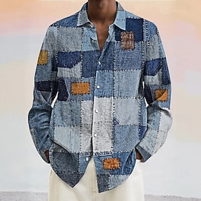 男性用 幾何学模様 カラーブロック デニムのような シャツ ボタンアップシャツ 長袖 ファッションカジュアル バケーション 日常 春 秋 折襟 3Dプリント リネンライクシャツ ブルー+カーキ ブルー ダークブルー ライトブルー