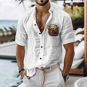 男性用 リネンシャツ カジュアルシャツ コットンリネンシャツ ボタンアップシャツ アニマル柄 バケーション デイリーウェア ブラック ホワイト ライトグリーン ピンク 半袖 ラペル オールシーズン 衣類 バックル