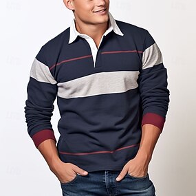 男性用 縞柄 ラグビーポロ 長袖 ポロシャツ 襟付きシャツ カジュアル 学校 アウトドア アスレイジャー 3Dプリント 春 秋 冬 ダークブルー