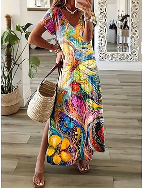 女性用 マキシドレス カジュアルドレス A ラインドレス サマードレス エレガント 旅行度假风 カジュアル ビーチ レギュラー フラワー グラフィック 半袖 Vネック ピンク ルビーレッド ブルー オレンジ 夏 春