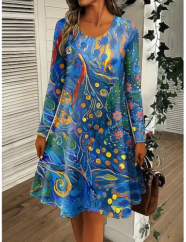 女性のミニドレス クルーネック ロングスリーブ カジュアルドレス Tシャツドレス ティードレス Aラインドレス カジュアル レギュラーフィット フローラル グラフィック 抽象 ピンク ブルー オレンジ グリーン 秋 冬