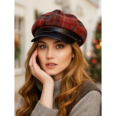 女性用チェック柄ニュースボーイキャップ(PUレザーバイザー付き)、ヴィンテージギャツビーベイカーボーイハット(複数色)、スタイリッシュなクリスマスパーティーアクセサリー、冬ギフト