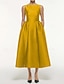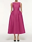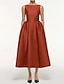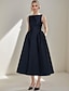 Aラインカクテルドレス、エレガントなドレス、フォーマルウェディング、ティーレングス、ノースリーブ、ボートネック、サテン、ひだ付き、ポケット