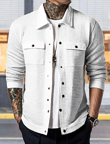 男性用 ワッフルシャツ シャツジャケット 冬物ジャケット 平織り バケーション デイリーウェア ブラック ホワイト カーキ色 グレー 長袖 ラペル 秋 冬 衣類 ポケット