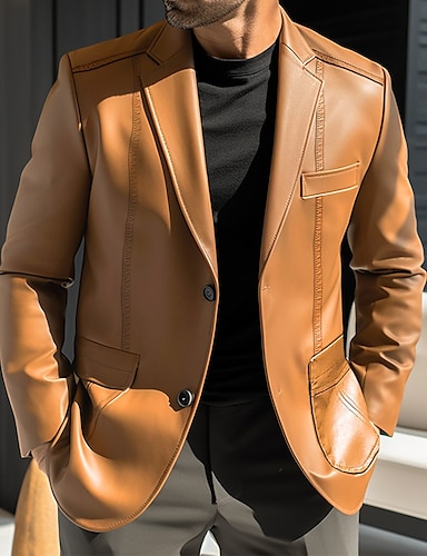 男性用 レザージャケット ブレザー アウトドア バケーション デイリーウェア ファッション ストリートファッション 秋 冬 ポリエステル 合皮 平織り ポケット ボタン 防風 ウォーム シングルブレスト ブレザー ブラック ルビーレッド ブラウン
