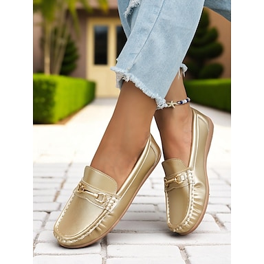 レディースゴールドフェイクレザーローファー - 毎日の通勤や週末のお出かけに最適な、メタルディテールが施されたクラシックなスリッポンモカシンフラット