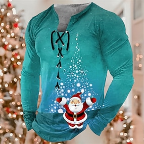 クリスマス メンズ サンタクロース ヘンリー T シャツ グラフィック T シャツ サンタクロース カラー グリーン ブルー パープル オレンジ レッド 3D プリント アウトドア 長袖 レースアップ カジュアル コットン
