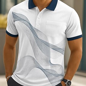 男性用 抽象的 ライン ポロ 半袖 ポロシャツ 折襟 ビジネス カジュアル カジュアル ボタン ポケット 夏 ホワイト