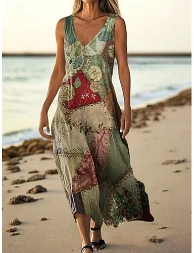 女性用 ロングドレス マキシドレス カジュアルドレス タンクトップワンピース サマードレス ヴィンテージ アフリカ人 日常 祝日 ビーチ レギュラー フラワー カラーブロック ノースリーブ Vネック ルビーレッド ネイビーブルー パープル グリーン 夏
