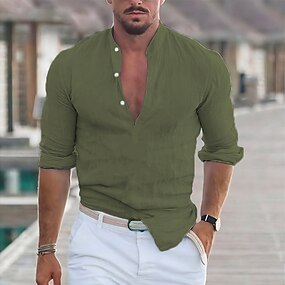 男性用 リネンシャツ ポップオーバー シャツ カジュアルシャツ バンドカラーシャツ 平織り バケーション キュリーズ ブラック ホワイト ピンク ネイビーブルー 長袖 カラー 春夏 衣類