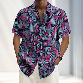 男性用 シュロの葉 熱帯植物 シャツ アロハシャツ ボタンアップシャツ 半袖 ハワイアン バケーション 祝日 ビーチウェア 夏 春 折襟 3Dプリント 襟付きシャツ フロントポケット1つ ブルー パープル グリーン