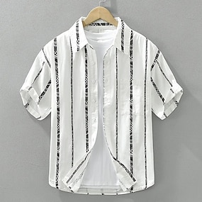 男性用 リネンシャツ サマーシャツ ビーチウェア ボタンアップシャツ ストライプ バケーション カジュアル ブラック ホワイト 半袖 折襟 夏 春 衣類