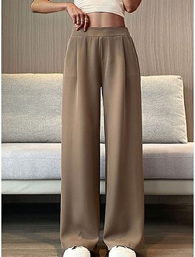 女性用 スーツ ファッション ロング丈 平織り サイドポケット ワイドレッグ 通気性 快適 伸縮性なし デイリーウェア カーキ色 春夏 レギュラー