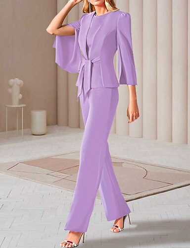 女性用 2ピーススーツ 結婚式のゲスト ウェディングパーティー シフォン エレガント ショールが含まれています 7分袖プリーツ アンクル丈