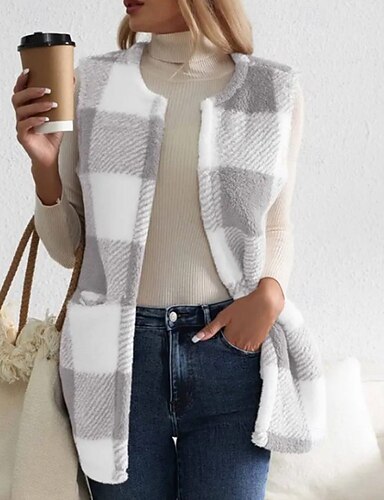 女性用 ベスト 快適 ポケット クラシック カジュアル チェック バケーション ストリート カジュアル お出かけ ロング 折襟 レギュラー ノースリーブ アウターウェア ライト 秋 冬