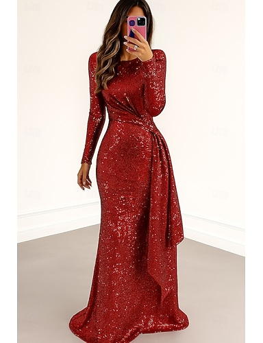 タイト/コラム イブニングドレス エレガント フォーマルドレス フォーマル 結婚式 フロア丈 長袖 クルーネック スパンコール とともに グリッター素材 プリーツ 2025