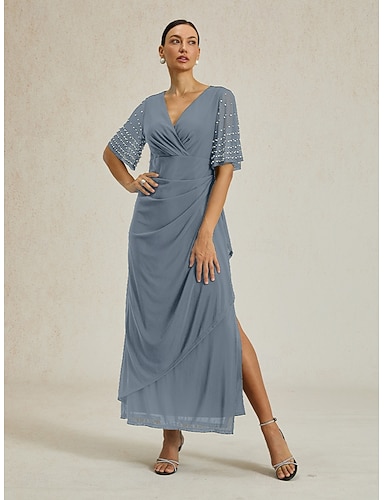 女性用 マキシドレス シースドレス エレガント 純色 半袖 Vネック ダスティブルー 夏 春 秋