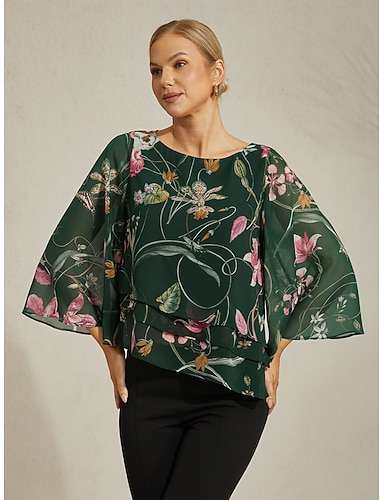 レディース ブラウス シアー シフォン グリーン 花柄 半袖 ラウンドネック レイヤードヘム プルオーバー カジュアル エレガント 春 夏 秋