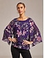 レディースブラウス シアーシフォン ダークパープル 花柄 ハーフスリーブ レイヤードヘム ラウンドネック プルオーバー