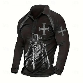 男性用 人間 ポロ 長袖 ポロシャツ ラペル ヴィンテージ カジュアル アウトドア ストリート デイリーウェア 3Dプリント ボタン 春 秋 冬 ブラック