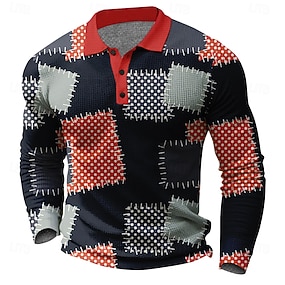 男性用 チェック ワッフルポロシャツ ゴルフシャツ 長袖 ポロシャツ 襟付きシャツ ヴィンテージ カジュアル バケーションウェア フォーマルウェア フェスティバルウェア ボタン 3Dプリント 春 秋 冬 黒/赤