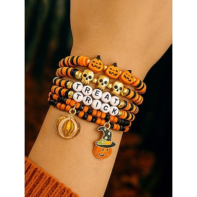 女性用ハロウィンビーズチャームブレスレット - カラフルなストレッチスタッカブルバングル。カボチャ、ゴースト、コウモリのペンダント付き。パーティージュエリーに最適。