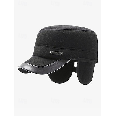 メンズ冬用耳あてキャップ - フェイクレザーのつばが付いた黒のフェイクウール混紡帽子、暖かく防風性のあるデザイン