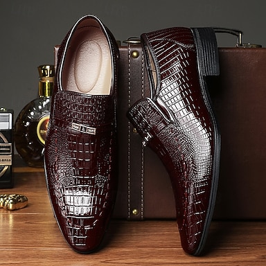 メンズ ブラック クロコダイル柄 パテントレザー ドレスシューズ - 結婚式、ビジネス、夜のイベントに最適なエレガントなスリッポン フォーマルシューズ