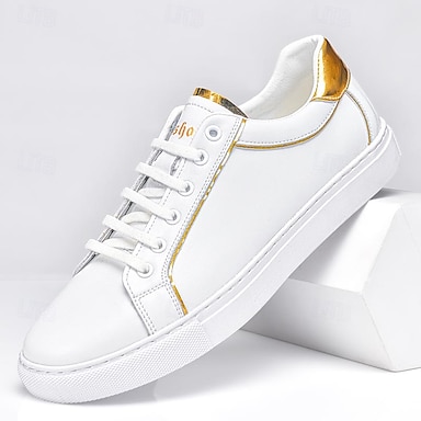 メンズのホワイトとゴールドのアクセントスニーカー。普段使いや旅行に最適なミニマリストカジュアルシューズ。