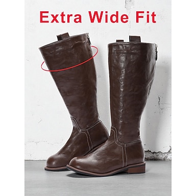ファーの裏地とジッパー開閉を備えた女性用のエクストラワイドフィットのブラウンニーハイブーツ。カジュアルな服装や秋冬シーズンに最適な、多用途で耐久性のあるブーツです。