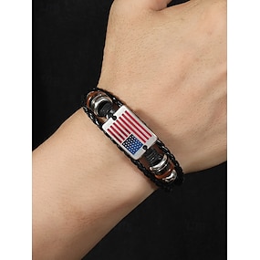 メンズレザーアメリカ国旗ブレスレット - カジュアルや愛国的な機会に最適な、金属と木製のアクセントが付いたスタイリッシュな編み込みストラップ