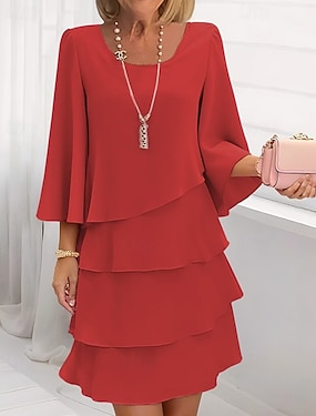 女性用 ミニドレス シフォンドレス ティアードワンピース ファッション 近代の アウトドア バケーション お出かけ レギュラー 平織り 七分袖 クルーネック ピンク ルビーレッド ネイビーブルー カーキ色 春 秋