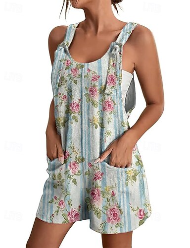 女性用 標準 ジャンプスーツ カジュアル フラワー ノースリーブ Uネック プリント ストリート 祝日 レギュラー ダックグレー 夏